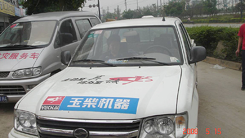 玉柴安达服务站派出的服务车和玉柴办事处的风行186车统一贴上"厦工救灾服务车"的字样 |