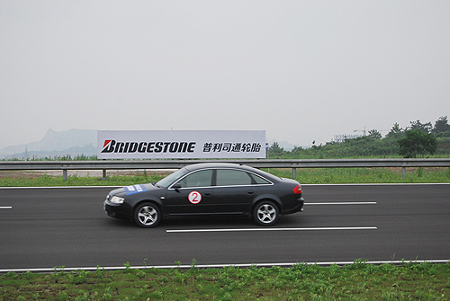 普利司通轮胎试验场建成于2007年末,今年3月正式投入使用,占地面积为83.9万平方米,是迄今为止所有轮胎厂商在中国建造的首条真正意义上的轮胎测试跑道,也是普利司通集团在全球的第11家轮胎试验场。该试验场在投入使用后,可以通过高速环路、高速操控坡路、综合试验路等不同状况的道路上的测试,分析轮胎的各种性能,不断对其进行优化,更好地为广大的消费者提供更齐全、卓越的产品。此外,除了将在中国市场进行的原配胎及零售胎的行驶测试、开发评价及性能确认实现快速化、效率化之外,该试验场还会应用于公司内外的促销活动和安全启蒙活动。