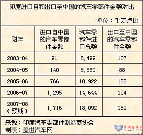 印度本国的一些轿车和两轮车制造商计划从中国进口大量的零部件,并已在中国建立了完备的采购办事处。他们认为在这个原材料高涨的艰难时世,中国产品的价格是很有吸引力的。印度马亨德拉(Mahindra&Mahindra)公司汽车部总裁PawanGoenka称:“对于某些汽车零部件,从中国进口这些产品的运输成本比在印度生产这些产品的原材料成本要低”。