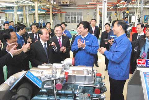 玉柴是全球最大的独立柴油发动机生产基地、中国最大的小型工程机械生产和出口基地,是中国动力第一品牌。司马义·铁力瓦尔地十分关心玉柴的发展,他走进车间,饶有兴致地参观了重型发动机生产线以及玉柴自主研发的具有国内领先、国际先进水平的发动机,向晏平详细询问了玉柴的生产经营情况。司马义·铁力瓦尔地对玉柴的科技创新大加称赞,在中国首台自主研发达到欧5排放标准的柴油发动机前,司马义·铁力瓦尔地高兴地拿起话筒大声说:“玉柴是中国的骄傲!玉柴对国家的贡献太大了!我代表中央代表团三分团向玉柴全体职工表示崇高的敬意!” 司马义·铁力瓦尔地希望玉柴继续坚持科学发展,创新发展思路,继续坚持以高科技提升产业实力,推动地方经济的大发展。