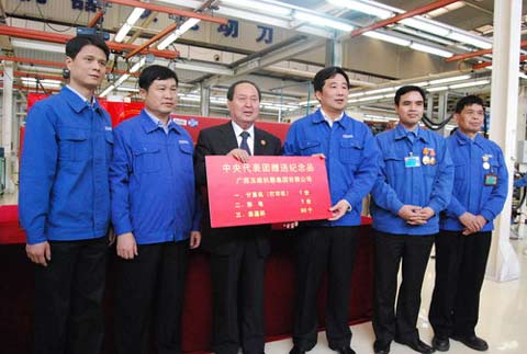 12月14日,中央代表团副团长、全国人大常委会副委员长司马义·铁力瓦尔地率中央代表团三分团来到玉柴,给玉柴全体职工带来了党中央、国务院的亲切关怀和全国人民的真诚祝福,与大家共同庆祝广西壮族自治区成立50周年。