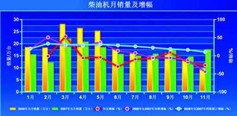 数据显示,进入2008年以后,发动机市场表现良好, 3月达到销售最高峰,单月销量突破90万台。在4月、5月保持了2个月的平稳运行后,从6月开始下跌趋势逐渐明显,7月环比下跌10.7%。此后,市场一直比较冷淡,7~11月,没有一个月单月销量达到70万台。