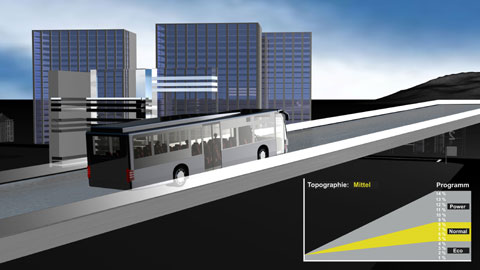 安装于Nova LFS客车的Ecomat变速器进入了新的发展阶段。它可以承受并传输更宽范围的发动机扭矩,最大扭矩可达1,750Nm,同时额外的冷却单元也进一步优化了产品性能。6速Ecomat自动变速器能完美适用于频繁启动的城市客车工况。他不仅能够提升司机与乘客的驾乘舒适性,也能很大程度的降低燃油消耗。TopoDyn是一款特别为城市客车应用开发的智能换档程序。与常规的常规动力换档变速器相比,结合了TopoDyn的Ecomat变速器可节省高达5%的油耗。当车辆滑行时,根据地形要求,变速器的控制单元会向TopoDyn换档程序发送信号,以供TopoDyn动态选择不同的软件。如此,就能保证发动机始终在最佳的转速范围内工作。