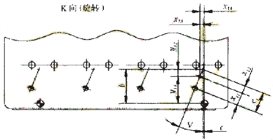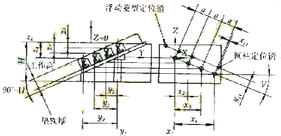 图2是夹具原理图。为了使汽缸盖喷油孔的轴心线与机床主轴平行,夹具的工件装夹平面(以下称主平面)与其底面成(90°-U)夹角,汽缸中心连线在夹具主平面内逆时针方向转V角度。加工程序的工件坐标原点(X,Y)设定在第一个喷油孔轴心线与夹具主平面的交点上,在此处开有环表找零点的工艺孔。Z方向的零点设在夹具顶面,夹具顶面与第一个喷油孔孔口面平齐,既可简化Z坐标计算,又便于机上对刀确定刀具长度。一只圆柱定位销固定不动,几只菱形定位销分别浮动,根据汽缸孔数量,确定使用哪一只菱形定位销。夹具主平面和其上所有孔,在具有分度工作台的卧式加工中心上一次装夹加工完毕,以保证加工精度。确定工件零点和定位销相对位置尺寸的x13、x13分别计算如下: