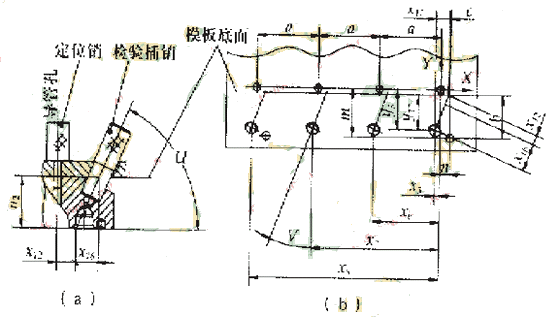 喷油孔的位置检验,用两只定位插销穿过检验模板在导管孔内定位,另一只检验插销逐个插检喷油孔的位置,如图4所示。喷油孔的位置精度和坐标尺寸均为自由尺寸要求,在加工中心上加工能适当提高坐标精度,把被提高部分的坐标精度和自由位置精度一并考虑,利用补偿原则确定检验插销的合适直径。检验模板上孔的坐标尺寸计算为