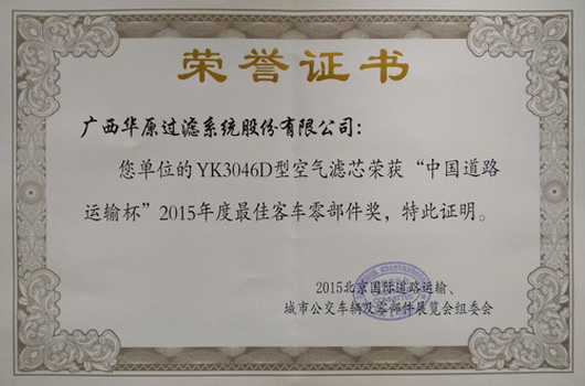 为期三天的2015北京国际道路运输、城市公交车辆及零部件展览会于2015年5月13日在北京国家会议中心落下帷幕。华原公司作为一家具备自主研发和完备检测能力的滤清器龙头企业,精心组织了满足国4以上发动机需求的产品参展,其中,参展产品经专业评委的筛选和现场评审,公司燃气低压滤清器YRQ-0001和空气滤芯YK3046D分别获评为“2015年度最佳新能源客车零部件奖”和“”。