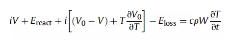 其中i和V为电池两极输出电压和电流,Ereact为电池内部材料和SEI膜分解产生的总热量,Vo为平衡电势,T为绝对温度,Eloss为通过热传导和热辐射的散热速率,右边则表示电池总的加热速率,其中C为比热容,ρ质量密度,W为总体积,t为时间。根据该公式可以推导出如下公式