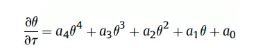 其中θ为无量纲温度,Τ为无量纲时间,αn为考虑到不同的分解反应的活化能和产热的参数。基于该公式可以对圆柱型锂离子电池的热失控过程进行描述,描述过程是基于三个变量U、V、W,而这几个变量又是基于θ和αn两个值。