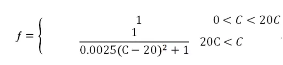 实验中发现在20C的电流下,磷酸铁锂18650电池是完全安全的,但是当电流达到30C的时候,电池温度开始升高,因此我们可以认为X<20C以下的时候,电池是完全安全的,因此安全函数ƒ值为1,30C以上时电池是不安全的,即电流为X=30C时,ƒ值为0.8。根据如下公式进行推导计算