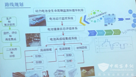 这就是我们规定整体的路线规划,也希望大家提一些相应的建议,因为我们也跟一些企业合作开展了相应的工作。我们知道,动力电池全生命周期的利用,包括初期的生产和首次的使用,也就是说在电动汽车上,也包括它的监控到评价、到再度的集成、到第二次的利用和回收。我们看一下第一阶段,生产和再利用的阶段,就是首次利用的阶段,在电动汽车上我们需要有一个运行的监控系统,就是说我刚才提到我们动力电池的编码制度已经有了,就是说这个时候电池从生产下来到电动汽车使用的时候已经有了一个身份证,我们可以全程知道它的身体状态、它所有的信息。而监控系统得到的数据有这样一些特点,它的实施性、它的惟一性和它的全面性、以及它的可全程追踪的特性。到了第二个阶段,健康状态的评价,也就是我刚才说的,全程的监测,是什么样一个概念呢?前面第一个监控系统,是给了电池的一个身份证,和了解它所有活动的状态。