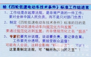 给《四轮低速电动车技术条件》标准工作组进言,正好标准工作组组长现在在场。