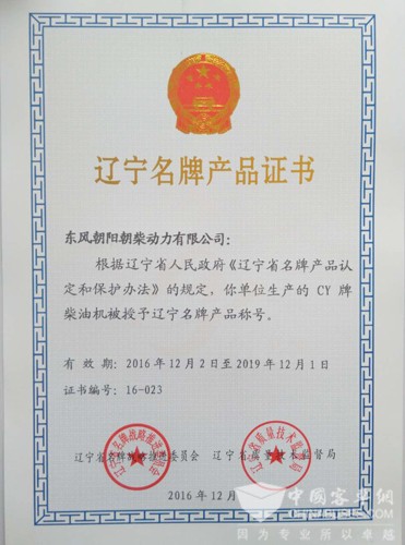 2016年12月,辽宁省质量技术监督局根据辽宁省人民政府颁发的《辽宁省名牌产品认定和保护办法》的规定,授予朝柴动力生产的“CY牌柴油机”为“辽宁名牌产品”荣誉称号,并颁发了证书和牌匾。