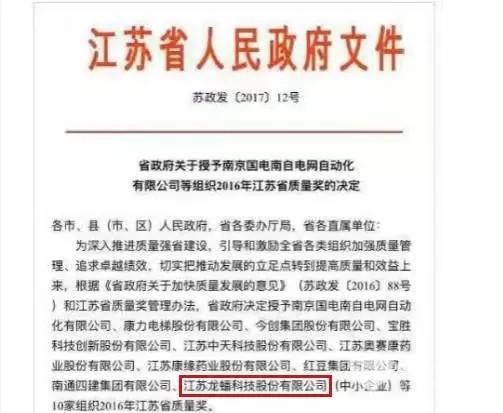 经江苏省政府质量奖评定委员会审议通过,龙蟠科技凭借先进的管理经验和优异的企业经营成果,从众多参选企业中脱颖而出,成功摘取2016年江苏省质量奖。这是继2014年荣获南京市质量奖之后,龙蟠科技在质量领域再一次荣获的一项殊荣。