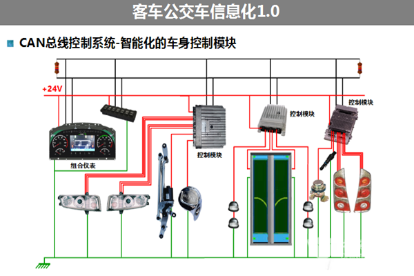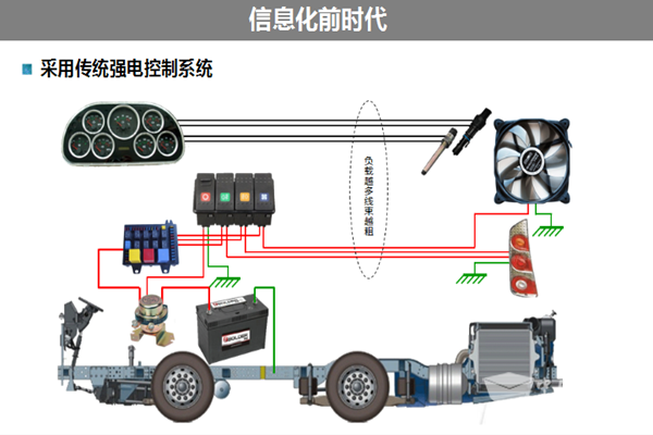 “国内客车公交车信息化发展简单分成几个阶段,第一个阶段是传统强电控制系统,我们称之为客车信息化前时代。”黄海平介绍,这个阶段有一个明显的特征即所有的电气负载和开关是直接相连的,负载的状态没有办法通过电流的变化进行检测或者进行判断,所以我们没有办法做相应的安全监控。这时候电气负载的安全主要靠保险丝,车辆的安全防范主要靠定期的维护保养。