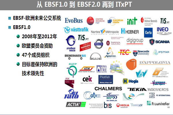 据黄海平介绍,EBSF的发起单位是欧盟委员会,实施单位是公共交通国际联会。从2008年至2012年,欧盟委员会资助47个成员组织以保持欧洲公交系统技术的领先性,这47个组织包括了整车厂、零部件供应商、大学、政府的管理机构以及公交公司。