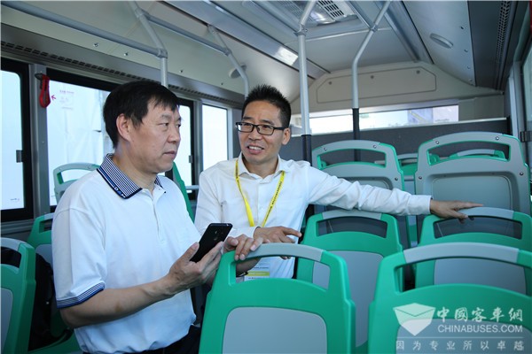 天海集团董事长吕超(右)在向嘉宾介绍轮毂电机客车