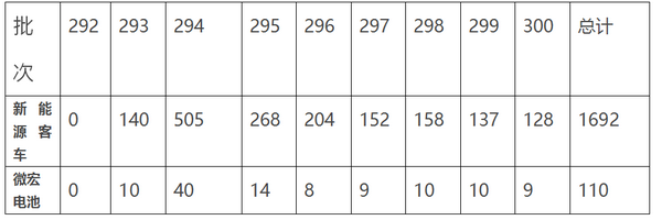 2月14日,工信部发布《公告》第293批,其中新能源客车140款,微宏为12款新能源客车配套,在30家配套动力电池企业中排位第五;