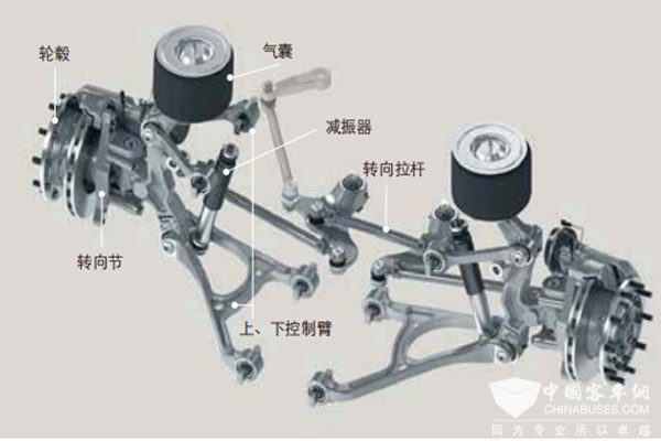 与AVE132低地板门式驱动后桥相配匹的RL85EC低地板独立悬挂前桥满足低地板或低入口公交客车的全面应用;高强度、易维护、可靠性高,轻量化设计可显著降低油耗及运营成本;独立悬架结构避免了左右车轮间运动的相互干扰,提高乘坐的舒适性;转弯半径比刚性车桥减少1米(同等轴距),提高车辆的机动性。