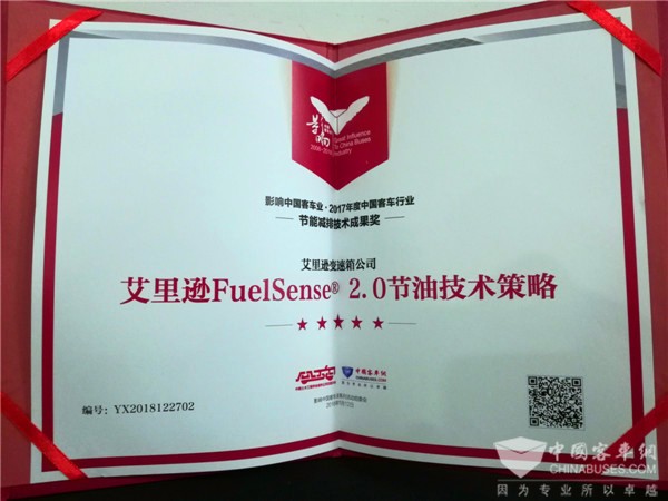 活动当晚,“第12届影响中国客车业年度盘点活动”评选结果正式揭晓,艾里逊凭借“艾里逊FuelSense® 2.0节油技术策略”和“艾里逊T系列变速箱”两项技术产品摘得2017年度客车“节能减排技术成果奖”和“国际营销协作奖”两项大奖,可谓好事成双。