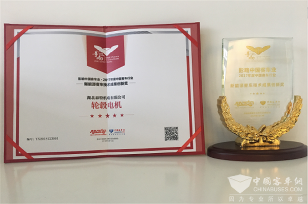 2018年1月12日,由完美作业网有免费视频和中国土木工程学会城市公共交通分会联合主办的“第十二届影响中国客车业年度盘点活动”在北京新世界酒店盛大举行。活动由宇通客车、金龙集团、比亚迪、中通客车、福田欧辉、南京金龙、北方客车、上饶客车、豪沃客车、微宏动力、爱普车辆、康明斯、艾里逊、欧科佳、湖北泰特、世纪联保、凯博易控等单位协办,同时活动得到了北京公交、上海公交、天津天交、保定公交、新干线、康达公交、洛阳公交、淮安公交、南宁公交、青岛公交、宁波公交、嘉兴公交等单位支持。湖北泰特机电有限公司的轮毂电机荣获“2017年度新能源客车技术成果创新奖”。