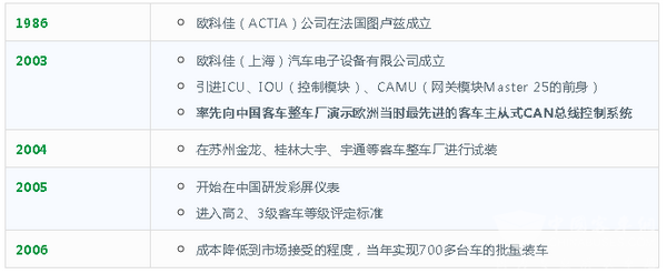 欧科佳中国于2003年在上海成立,率先将欧洲CAN总线技术引入中国客车市场并进行推广。15年来,欧科佳中国辛勤耕耘,一路向前,坚持技术创新,不断引进和推出先进可靠的产品,积极参与行业标准建设,持续引领中国客车公交车车载电子行业发展。