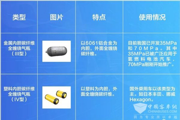 主要应用于车载系统,大多使用金属内胆碳纤维全缠绕气瓶(III型)和塑料内胆碳纤维全缠绕气瓶(IV型)。