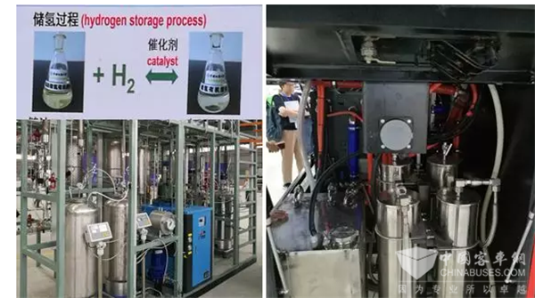 液体有机储氢材料最大的特点就是常温下为液态,能够十分方便地运输和储存。整个使用过程中完全通过热交换降低能耗,且没有温室气体排放,安全保障。其中,武汉氢阳研发了一种稠杂环有机分子作为有机液体储氢材料,储氢高达58g/L,不存在副产物,可逆性好,并可在常温常压下利用管道、槽罐车等运输。该有机液体储氢材料已经投入应用。图为武汉氢阳有机液体储氢。