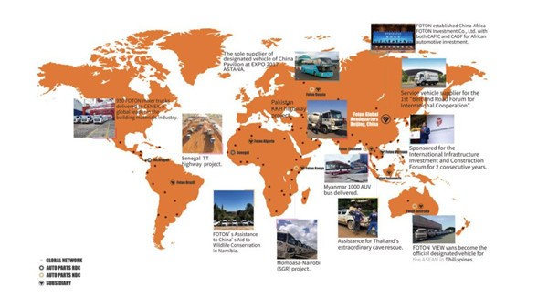 作为我国最早“走出去”的企业之一,福田汽车谋划全球化发展,已在全球范围内拥有9大独立国家公司,2000多家海外分销网点、3个全球共享仓储平台、4个国家配件分拨中心、10个服务培训中心,产品及服务遍及全球超过110个国家。在全球启动34个组装工厂项目,建成KD工厂27个,产能达到10万台/年。截止到2018年,福田汽车海外累计出口商用车55.6万辆,连续8年位居中国商用车出口第一。