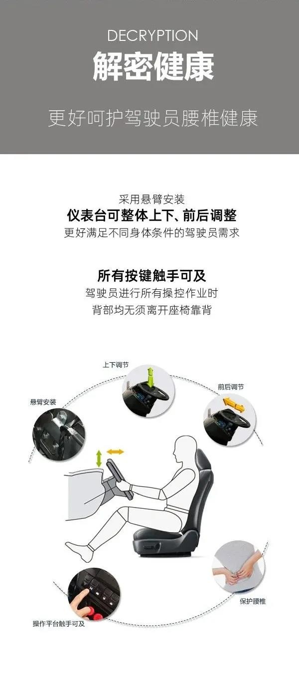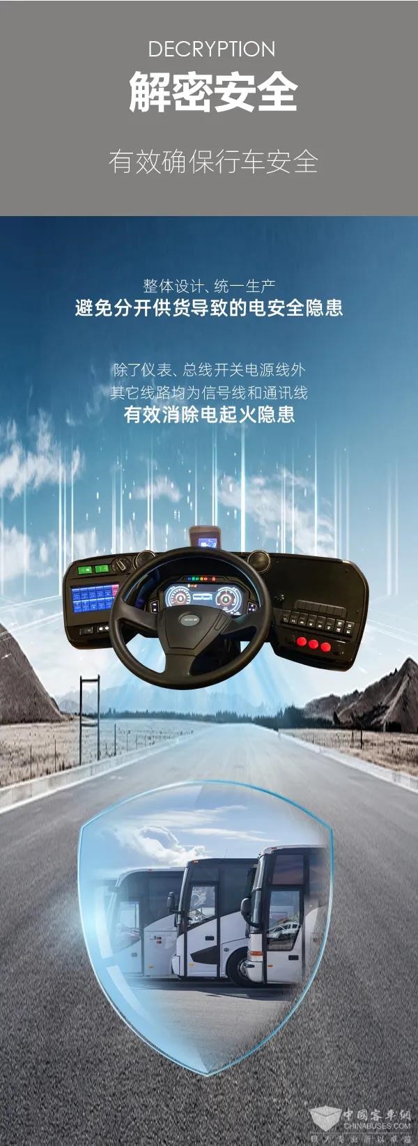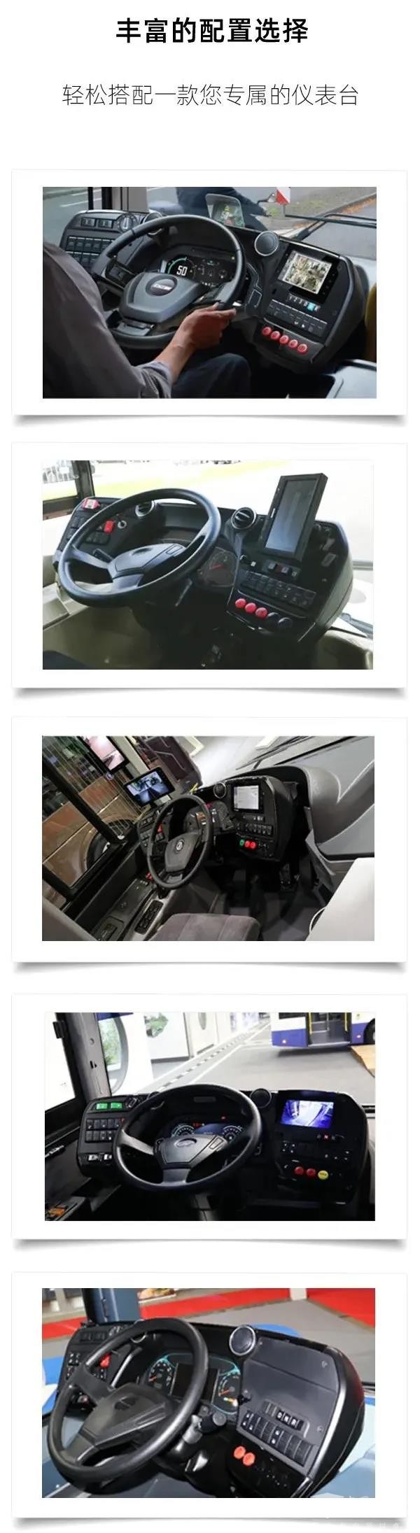 它采用悬臂安装,仪表台可整体上下、前后调整,所有按键触手可及,驾驶员操作时背部无需离开座椅靠背。产品整体设计、统一生产,除仪表、总线开关电源线外,其他线路均为信号线和通讯线,有效消除电起火隐患。同时,仪表台左、右、中间等部分提供丰富的配置选择,并可选配抬头显示器和智能触控屏,强劲且全面的产品性能助力中国客车底气十足走四方。