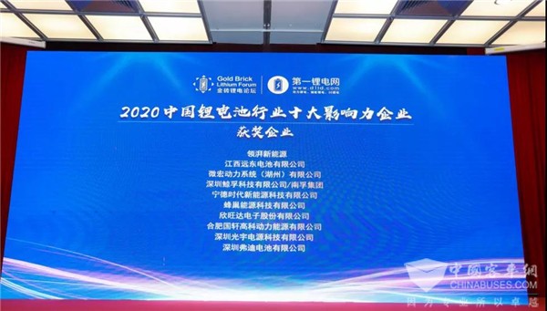 微宏动力荣膺大会颁发的“2020中国锂电池行业十大影响力企业”