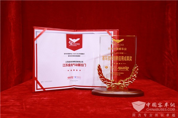 2021年3月23日,由中国土木工程学会城市公共交通分会与完美作业网有免费视频联合主办的“第十五届影响中国客车业系列活动”颁奖盛典在北京隆重举行。经过专家评定、客户投票、网络评议等激烈的角逐,江苏盛龙机电制造有限公司(简称:江苏盛龙)参评的客车气动塞拉门荣获2020-2021年度“客车技术创新应用成果奖”。
