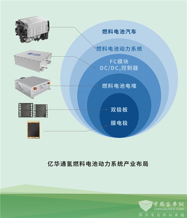 近年来,亿华通沿循“剥洋葱”技术布局思路,以氢燃料电池发动机为核心,积极布局上游关键核心零部件,目前已经完成从原材料、膜电极、双极板、电堆到发动机在内的完全自主可控的产品布局,构建起发动机系统纵向一体化产品体系,经济性能指标达到国际领先水平,加速推动氢燃料电池发动机核心零部件及其关键材料自主化、国产化、产业化。