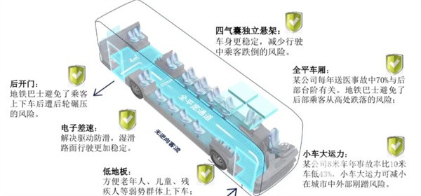 车内全平地板结构带来本质安全,减少车辆急加速急减速造成的磕碰划伤,无尾部“后山”结构,避免车辆后部区域老年乘客高处跌落造成恶性事故的风险。据数据统计,“地铁巴士”较传统车型车内客伤事故率降低70%左右。
