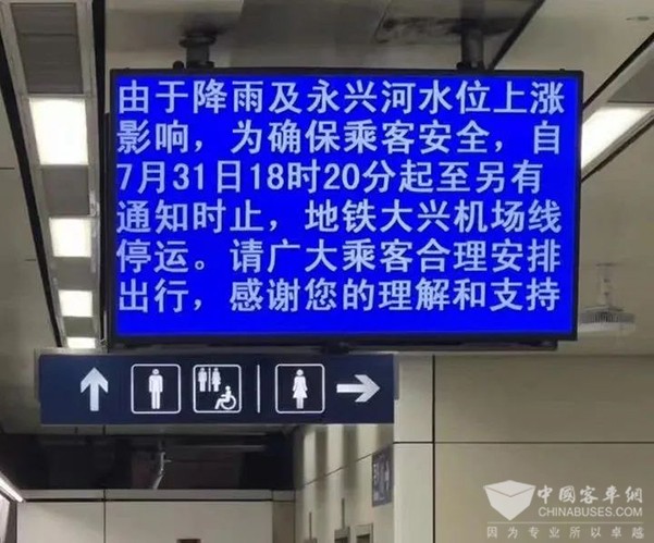 2023年7月31日,18:20,由于降雨及永兴河水位上涨影响,地铁大兴机场线停运。19:23,氢动力科技接到命令转运大兴机场因地铁停运滞留旅客;19:30,首辆国家电投氢能大巴驶出大兴车场;20:03,首批国家电投氢能大巴到达大兴机场指定位置开始转运接驳。