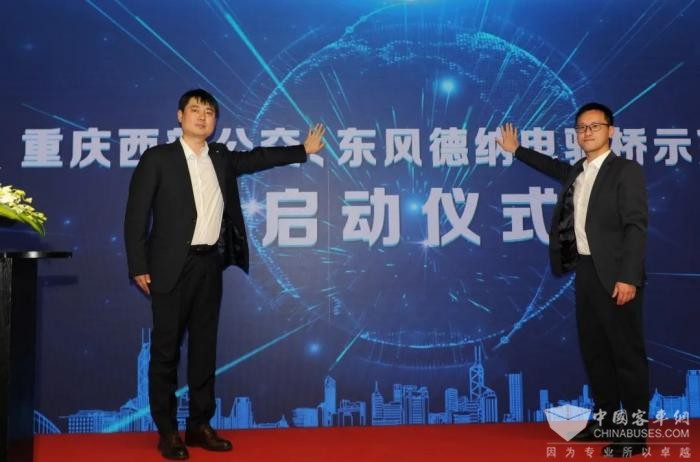 为充分展示该批微循环公交的运营风采及给乘客带来更好的乘坐体验,重庆西部公交与东风德纳车桥深度合作,针对该批微循环公交在重庆市场建立EP6 电驱桥示范运营线,在现场嘉宾的共同见证下,赖仁强先生与公司市场营销总监李靖共同启动电驱桥示范线。