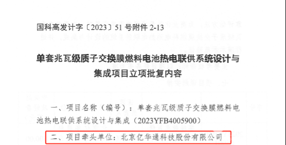 近日,由亿华通牵头申报的国家重点研发计划“氢能技术”3.4项目 “单套兆瓦级质子交换膜燃料电池热电联供系统设计与集成”(项目编号:2023YFB4005900)获得科技部正式批复,是亿华通在氢能领域的科研实力和技术优势的有力证明,标志着亿华通在燃料电池科技创新方面迈出重要一步。