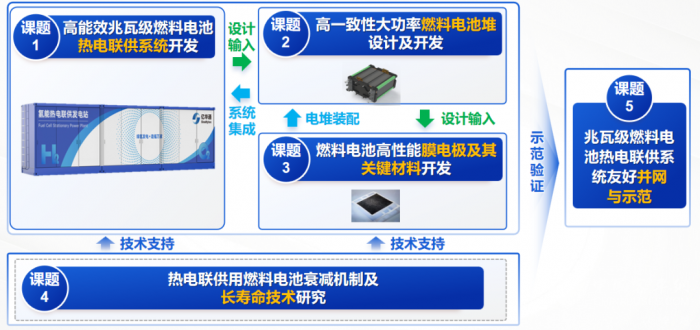本项目是由亿华通作为牵头单位,清华大学、中国科学院宁波材料所、华北电力大学、中国电力科学研究院、北京交通大学、有研工研院、国网新疆电力、伊宁联创城市建设有限公司、上海智能新能源汽车科创功能平台共十家单位组成技术攻关团队,重点推进氢燃料电池在热电联供领域的应用,开发单套兆瓦级质子交换膜燃料电池热电联供系统,并在新疆伊犁开展示范应用。