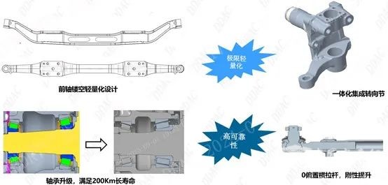 镂空轻量化前桥总成采用模块化思路进行总体布置,进行极限轻量化设计,相较老结构,桥总成轻20公斤以上;横拉杆总成刚性提升80%;轮端轴承寿命更强,可满足200万Km使用要求;零部件品种更简,桥架总成的核心零部件可实现鼓桥、盘桥共用;接口更优,满足模块化、标准化特点,方便各种配置拓展,满足客户个性化、差异化需求应用。