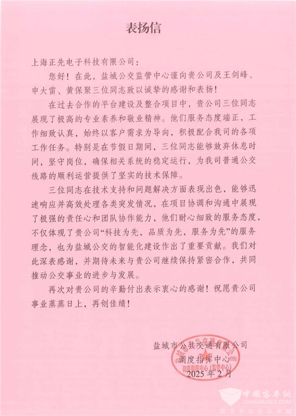 在此次项目推进过程中,正先团队克服施工环境复杂、系统对接紧迫等挑战,提供全天候技术支持,确保项目改造顺利进行,并在短时间内完成设备调试与上线工作,保障了盐城公交线路的平稳运行。此次表扬信不仅是对正先技术实力的认可,更是对公司服务精神的肯定。