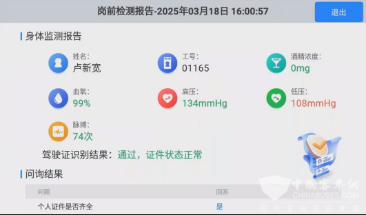 系统能够与岗中DMS人脸识别联动,实现岗前检测通过才允许启动车辆,从根本上杜绝岗前检测异常的驾驶员上车,为公交运营安全提供强有力的技术保障。