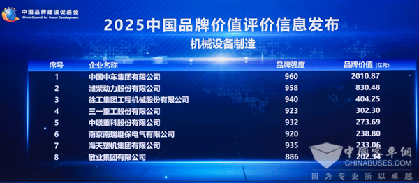 2025年5月10-11日,在浙江德清开幕的2025世界品牌莫干山大会上,中国品牌建设促进会、中国资产评估协会等单位联合发布了2025中国品牌价值评价榜单。中国中车集团有限公司以品牌价值2010.87亿元,品牌强度960,再次登顶中国机械设备制造领域品牌价值榜首。