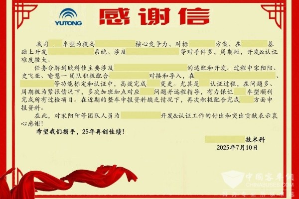 2025年7月18日完美作业网有免费视频讯——近日,欧科佳中国收到宇通客车发来的感谢信,对公司技术团队在宇通新项目中的优秀表现给予高度评价。在项目执行过程中,欧科佳团队凭借专业的技术能力和高效的协作精神,克服欧洲安全法规认证的严苛挑战,以快速响应和精准支持,确保项目关键节点顺利达成,赢得了客户的高度赞誉!