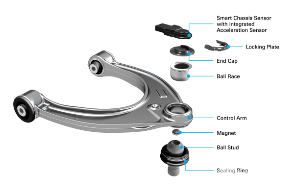 与第一代产品相同,新一代智能底盘传感器采用嵌入式设计,直接集成于独立悬架系统的标准部件球铰之中。球铰具备稳定的阻尼特性和精准的车轮导向功能,这使得传感器能够精确测量球头处车轮与车身的相对运动。采埃孚通过将测量电子元件集成到球铰内部,使智能底盘传感器成为球铰的内置组件,不仅重量轻、坚固耐用、信号质量高,更显著简化了安装流程。