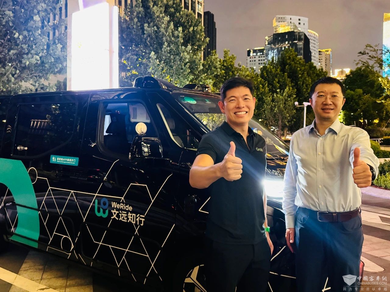 (Grab联合创始人兼集团CEO陈炳耀与文远知行创始人兼CEO韩旭在文远知行Robotaxi GXR前合影,中国上海)