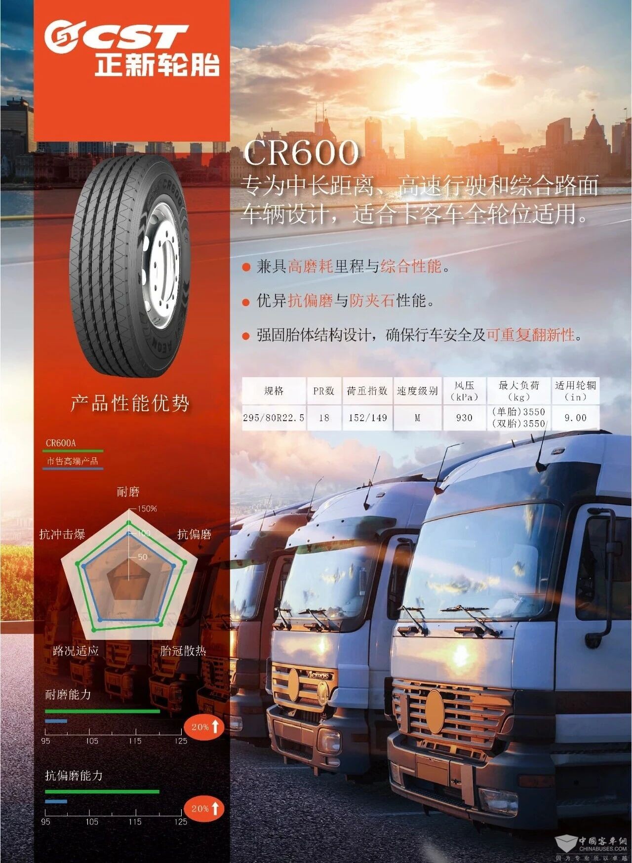 专为中长距离、高速行驶和综合路面车辆设计,适合卡客车全轮位使用;· 宽胎面、高沟深设计,磨耗里程高、综合性能佳;· 胎肩特殊强化花纹设计,提供优异的抗偏磨性能与防夹石性能;· 强固胎体结构设计,确保行车安全及可重复翻新性。
