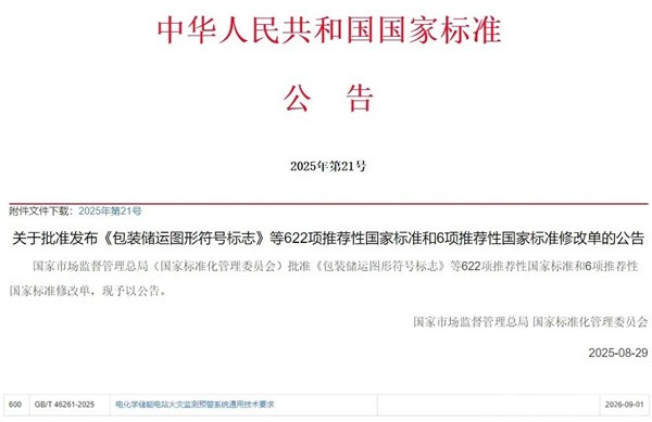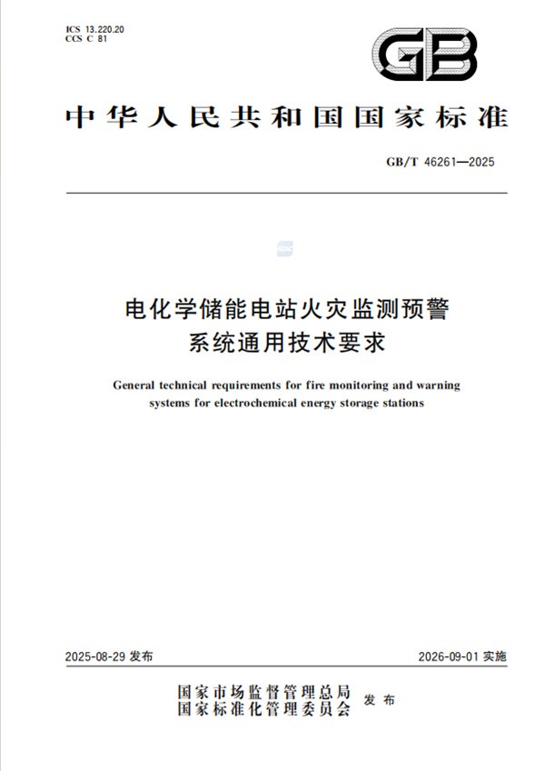 2025年8月29日,国家市场监督管理总局、国家标准化管理委员会正式发布《GB/T 46261-2025 电化学储能电站火灾监测预警系统通用技术要求》,标志着我国电化学储能电站安全防控迈入标准化、系统化、智能化新阶段。