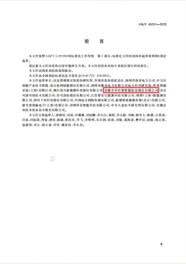 中科中涣参编首个电化学储能电站火灾监测预警系统国家标准