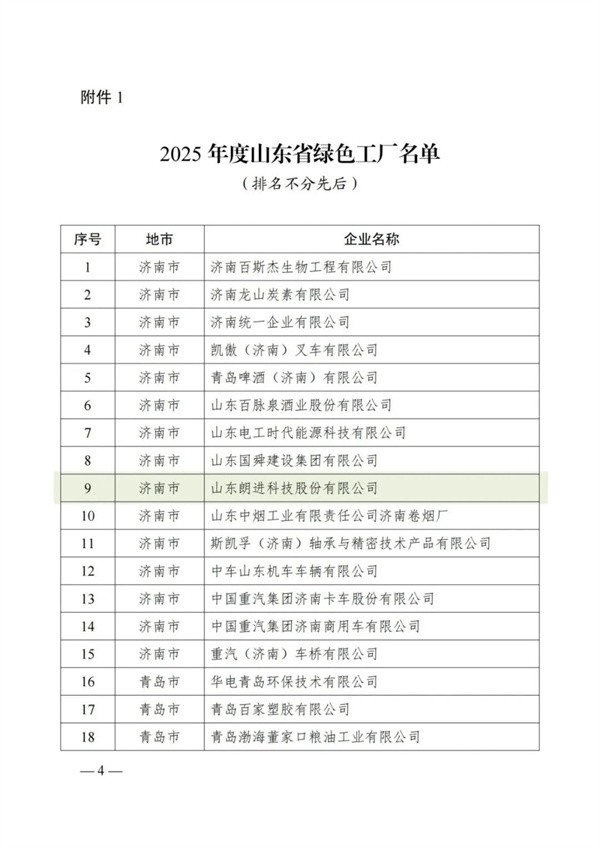 朗进科技荣获“2025年度山东省绿色工厂”认定
