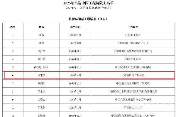 比亚迪廉玉波、宁德时代吴凯 汽车行业新增两位院士!