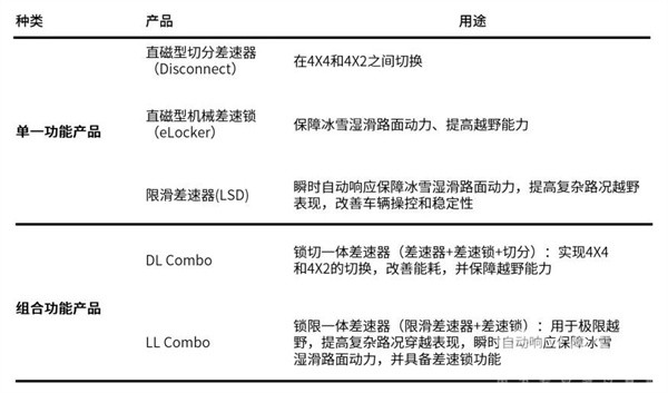 所有组合功能产品的封装尺寸和机械接口均可与传统开放式差速器或单一功能产品保持一致,整车厂无需更改驱动轴或安装方式,即可提供常规、断开、锁止和各种组合等不同驱动模式。其中DL Combo锁切一体差速器,作为组合功能系列的首推产品,是全球首款集差速、切分与锁止功能于一身的产品。